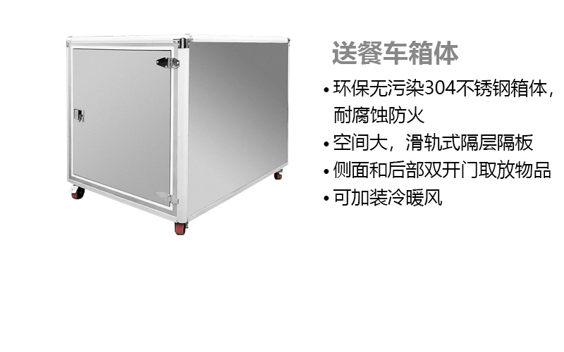 送餐車箱體特點(diǎn):箱體材料采用環(huán)保無污染 304不銹鋼材料,具有耐腐蝕防火特點(diǎn)??臻g大,滑軌式隔層隔板。 側(cè)面和后部雙開門方便用戶取放物品。可加裝冷暖風(fēng)。